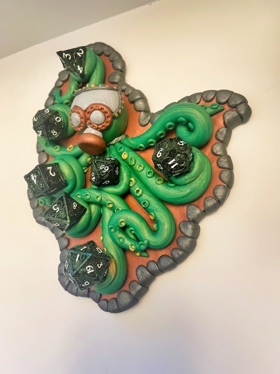 But this sculpture is more than just a feast for the eyes – it’s also a functional dice display. The kraken’s tentacles provide ample space to store and showcase your favorite dice sets, ensuring they are always within reach when your next gaming adventure beckons. Whether you’re a seasoned tabletop gamer or a collector of unique curiosities, this sculpture is sure to become a centerpiece of your gaming collection. It includes a metal set of Kraken dice that can be used in any ttrpg session!